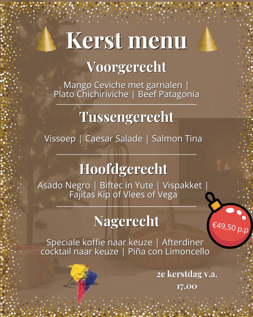 Zin in een kerst vol Latin vibes? Op tweede kerstdag serveren we vanaf 17.00 uur ons speciale kerstmenu voor €49,50 p.p. Reserveer je tafel telefonisch of per mail en proef de warmte van Latijns-Amerika.